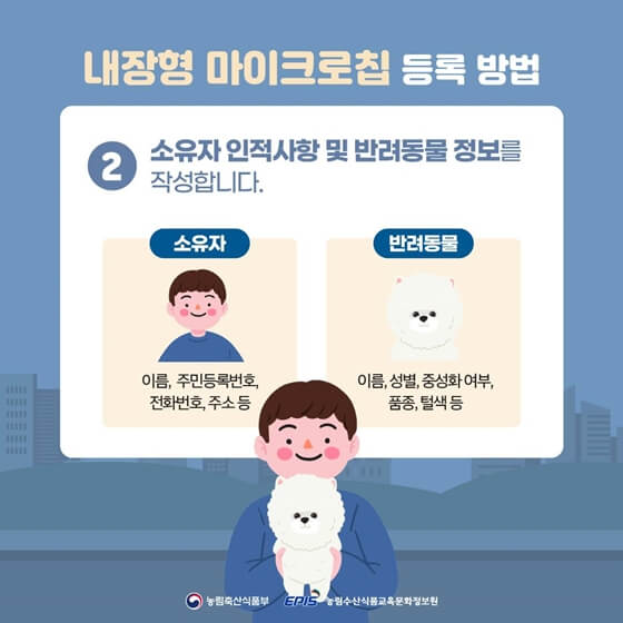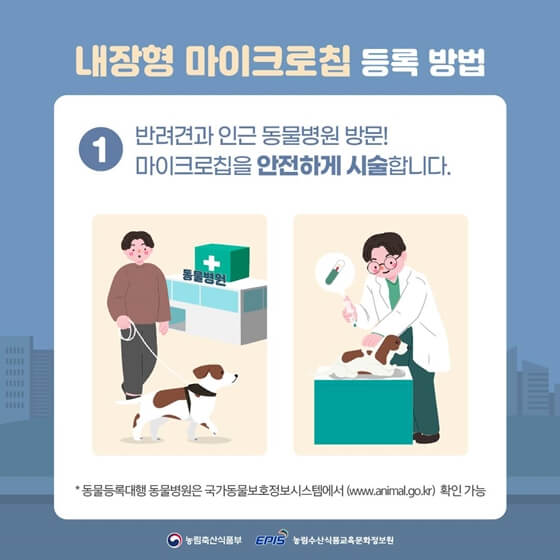 - 등록방식 선택 : 내장형과 외장형 중 선택할 수 있습니다. 특히 무선전자개체식별장치(마이크로칩)를 동물 체내에 삽입하는 방법으로 등록할 수 있습니다. 이는 훼손 위험이 적고, 분실 시 가장 신속하게 찾을 수 있는 방법입니다.
