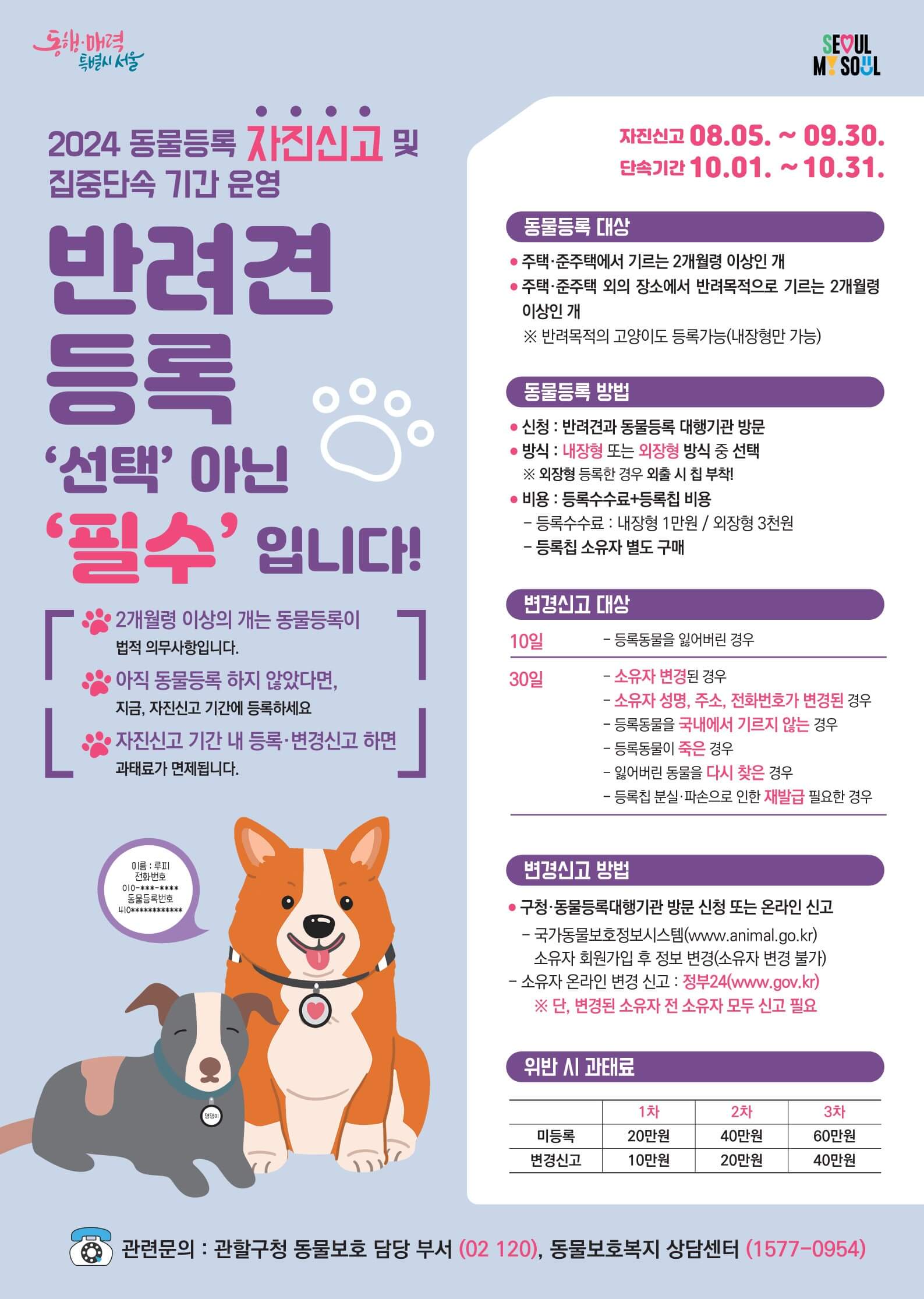 서울시 동물등록 자진신고 기간이 끝나는 10월부터는 미등록 반려동물에 대한 집중 단속이 실시됩니다. 이때, 등록하지 않은 반려동물 소유자에게는 최대 60만 원의 과태료가 부과될 수 있습니다.