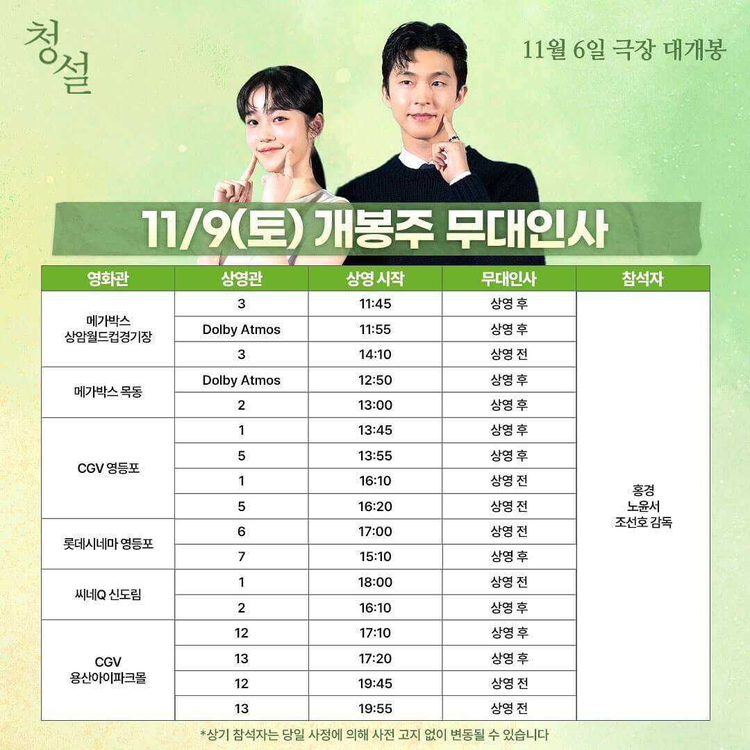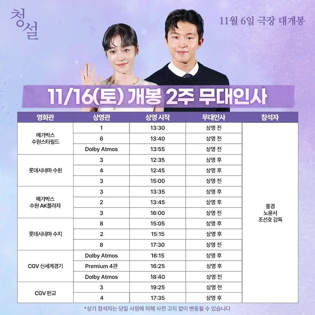 개봉 전주인 11월 2일 토요일, 11월 3일 일요일을 시작으로, 개봉일인 11월 6일 수요일부터 본격적인 무대인사 일정이 시작됩니다. 11월 9일 토요일, 11월 10일 일요일, 11월 16일 토요일, 11월 17일 일요일, 그리고 개봉 3주차에도 진행되며, 11월 23일 토요일, 11월 24일 일요일을 끝으로 무대인사 일정이 마무리됩니다.
