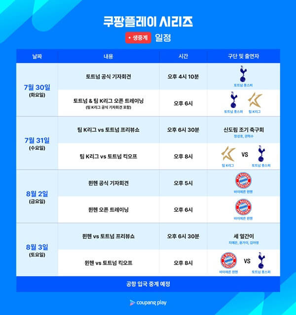 2024 쿠팡플레이 시리즈를 통해 세계적인 명문 구단의 경기는 물론, 손흥민과 김민재의 활약을 현장에서 직접 관람할 수 있습니다. 토트넘 뮌헨 경기 일정, 중계 정보, 그리고 하이라이트 다시 보기까지 꼼꼼히 확인하시고, 뜨거운 여름을 축구와 함께 즐기시길 바랍니다.