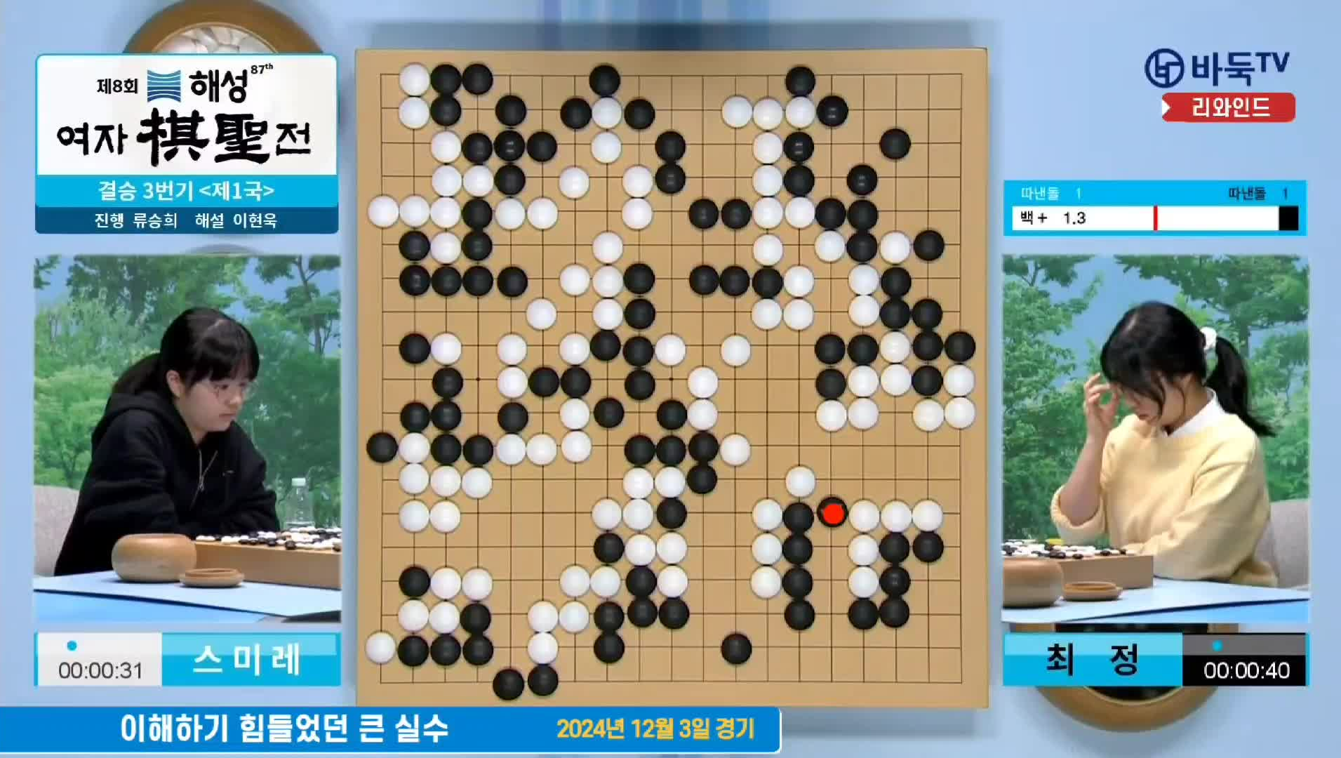 스미레 3단은 초반에 적극적인 공격을 시도했으나, 최정 9단의 탄탄한 수비와 반격에 밀려 아쉬운 패배를 기록했습니다.
