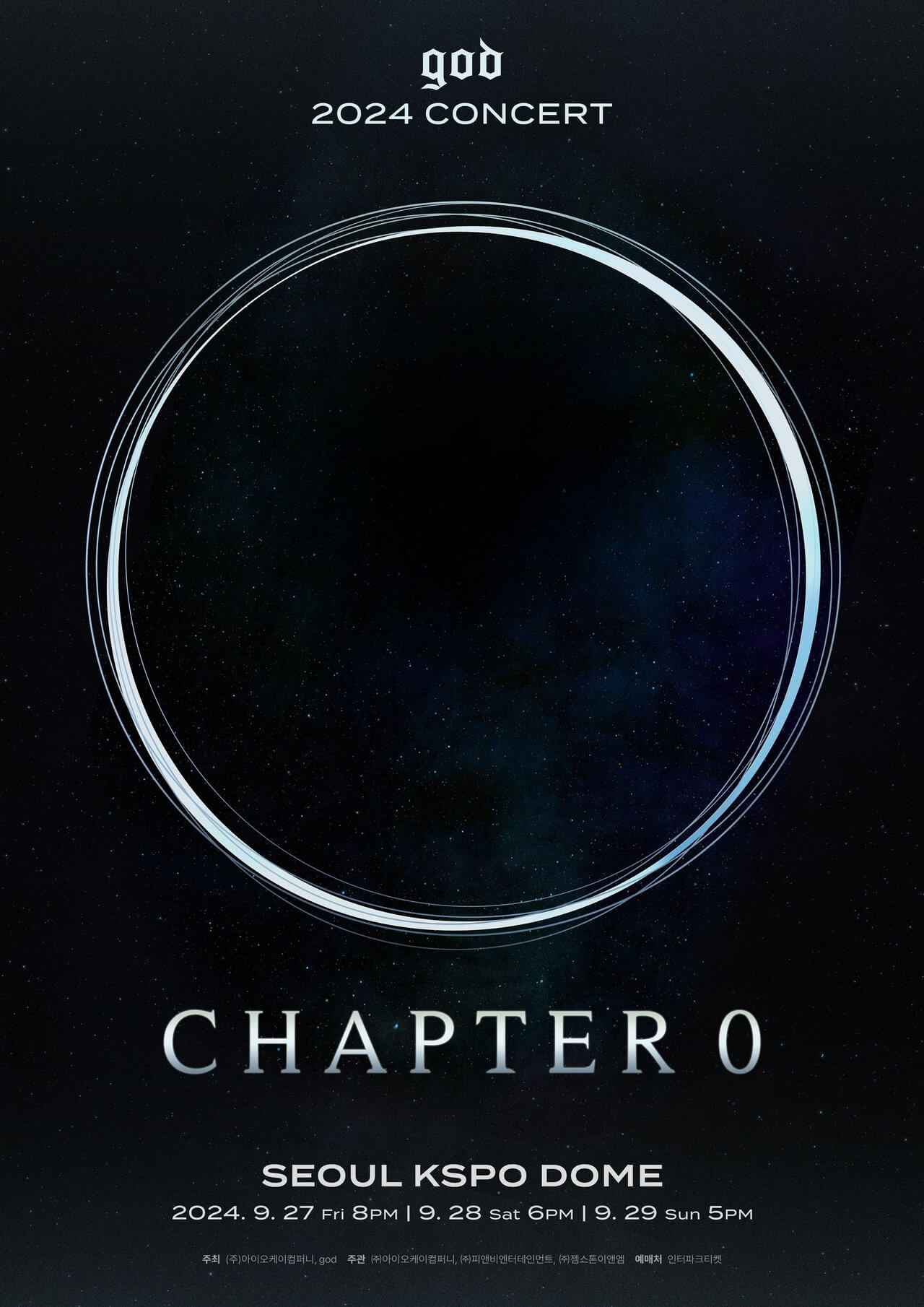 2024 god 콘서트 'Chapter 0'은 서울 올림픽체조경기장에서 열리며, 공연 시간은 금요일 오후 8시, 토요일 오후 6시, 일요일 오후 5시입니다.