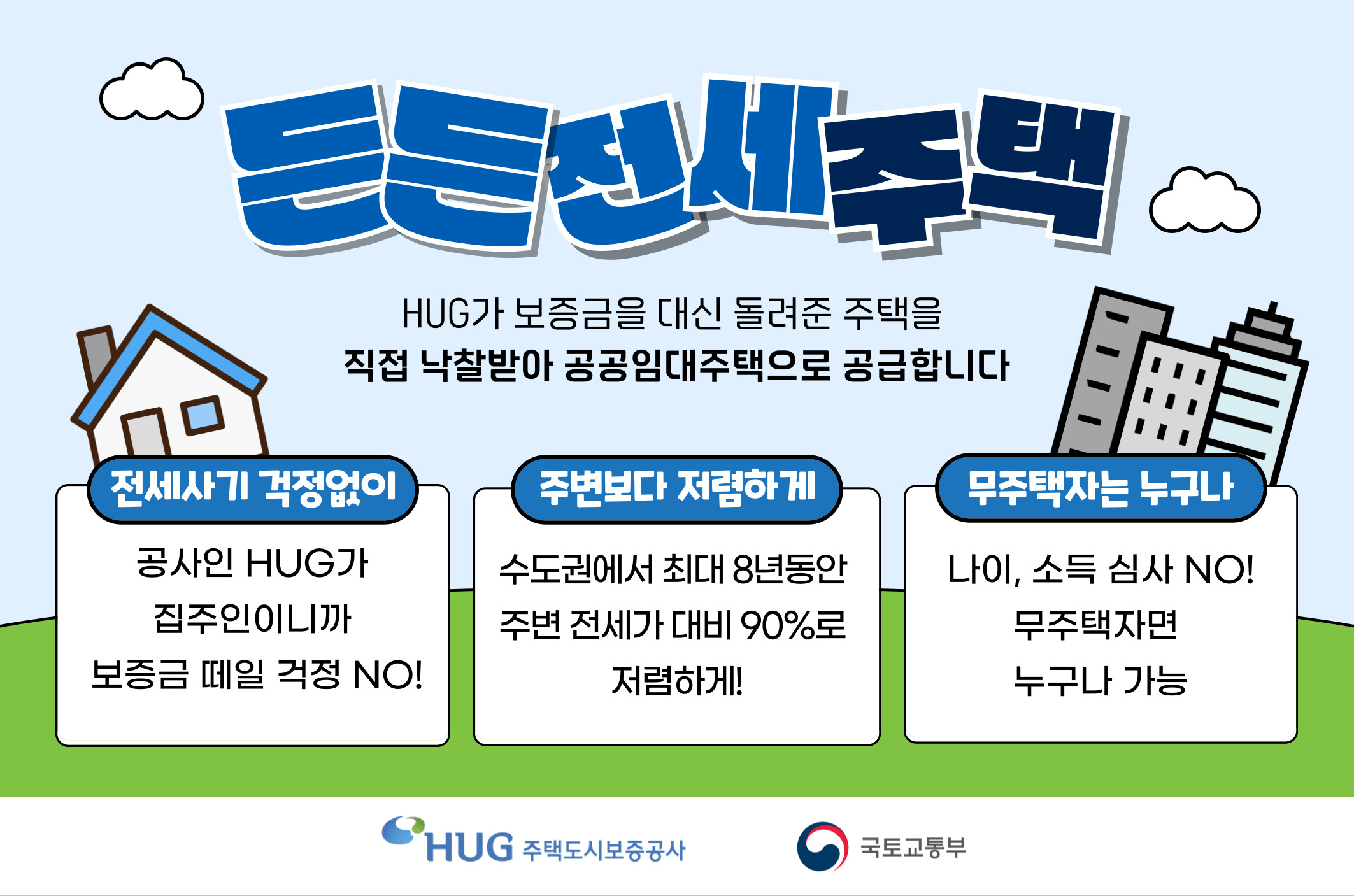 이름만 들어도 든든한 든든전세주택은 시세의 90% 전세주택을 지원해주는 제도로, 저렴한 가격에 전세집을 찾는 게 어려운 요즘 시대에 이용하기 좋은 제도입니다. 국토교통부에서 2년 간 든든전세주택 2만5천여 가구를 공급한다고 밝혔습니다.