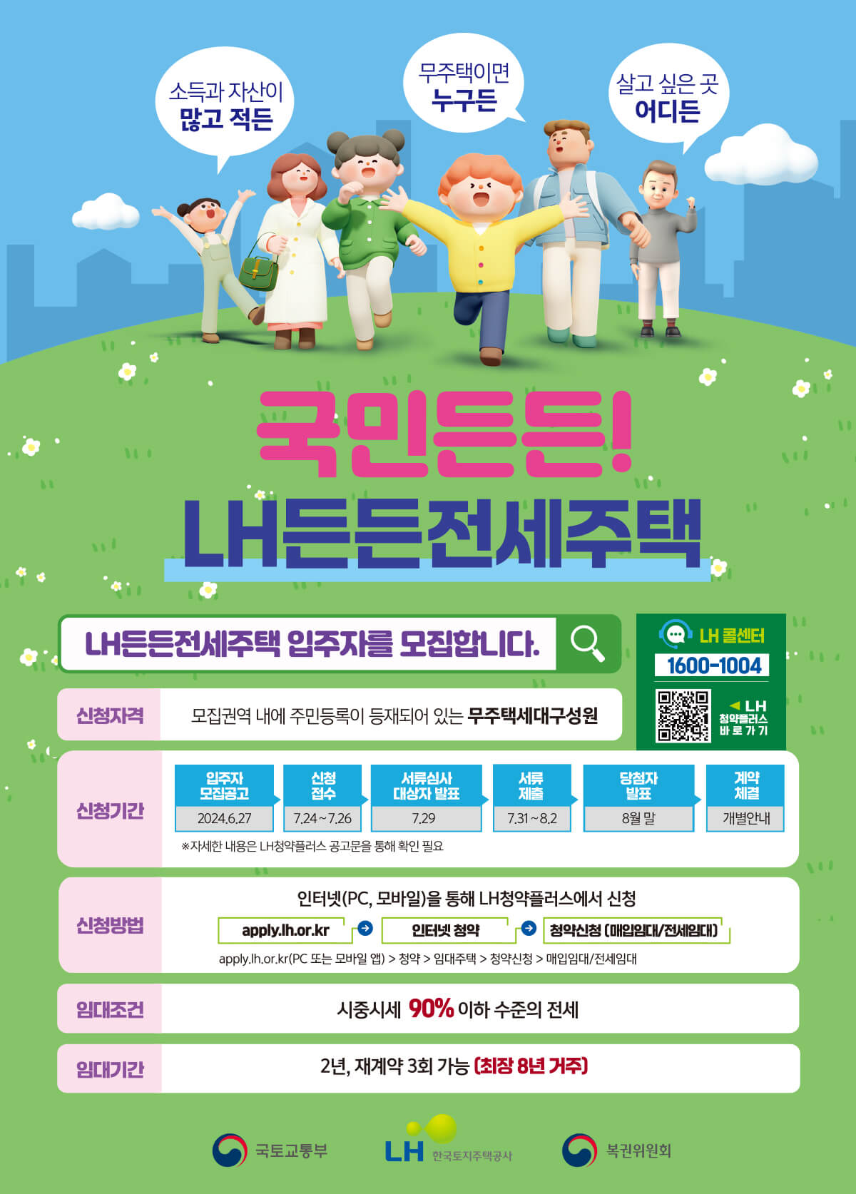 LH 든든전세주택은 2024년 6월 27일부터 모집 공고를 시작하였고, HUG 든든전세주택은 7월 24일부터 모집 공고가 시작될 예정입니다. LH 든든전세주택 신청접수기간이 7월 24일부터 7월 26일까지 3일간만 진행되니 이 제도에 관심이 있으신 분들이라면 신청기간을 미리 확인하셔서 기간에 맞춰 신청하시길 바랍니다.