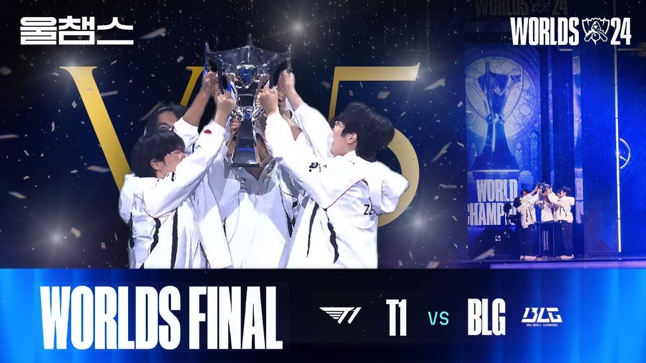 2024년 11월 2일, 영국 런던의 O2 아레나에서 열린 '리그 오브 레전드 월드 챔피언십(롤드컵)' 결승전에서 한국의 T1이 중국의 빌리빌리 게이밍(BLG)을 세트 스코어 3대 2로 꺾고 우승을 차지했습니다.